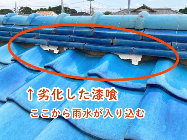 漆喰が劣化して崩れると、瓦のズレや棟の歪みが生じやすくなり、結果として雨漏りや下地の腐食につながるリスクが高まります。(※下記画像参照)