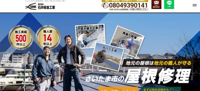 株式会社石井板金工業は、埼玉県全域・東京23区・近郊エリアを対象に、屋根修理・雨漏り修理・板金工事を専門に行っている職人直営の施工店です。営業職を置かず、職人自らが現場調査・施工・アフター対応まで一貫して担当しているため、余計な中間コストがかからず、高品質な施工を適正価格で提供できるのが特徴です。