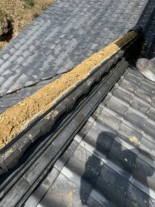 築40年のお住まいで現地を確認したところ、棟内部に多く使用されていた葺き土が経年劣化により痩せてしまい、余分な土が外へ流れ出している状態でした。