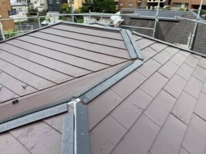 屋根の頂上部分「棟」にあたる部分には、屋根材と屋根材の隙間ができるので、そこから雨水が染み込まないよう、棟板金が覆うように設置されています。