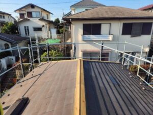 棟板金の下には、土台となる木製の貫板が設置されています。