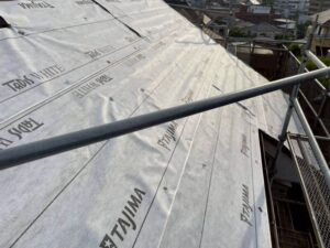 防水シートは屋根に降った雨水が野地板などの土台となる木部の部分へと進行することを防ぐためのものです。