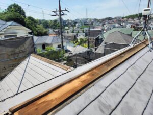 屋根材はこのまま残しますが、突出した頂上部分の棟板金だけ最初に外す必要があります。