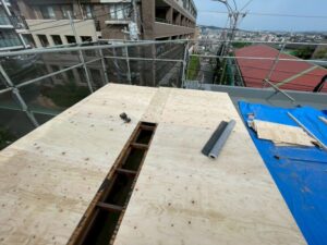 野地板は、写真のように、屋根の面を支える広く平たい建材です。