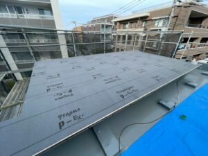 野地板に重ねて、防水ルーフィングを施工。