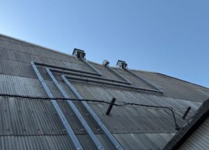 センターの既存竪樋に加え、両サイドに2本の竪樋を新設し、屋根部分に特殊な樋(集水用部材)を設置いたしました。これで雨水の流れを分散させながら竪樋へ逃がす構造になりました。