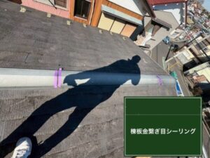 棟板金同士がつながる部分にできる隙間にはシーリング材を入れ、雨水の侵入を可能な限りシャットアウトしていきます。