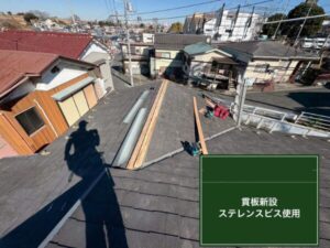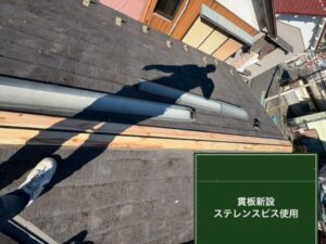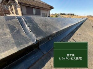 棟板金は以前使用されていたものをそのまま使用していますが、土台の貫板を交換し、ステンレスビスで固定したことで、耐久性が大幅に向上いたしました。