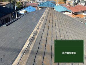 棟板金とともに、棟板金を固定していた土台の貫板も一緒に取り外します。