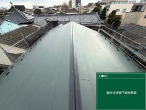 防水シートに関しては破れている箇所がありつつも、下地である野地板はまだしっかりしている状態でしたが、この機会にメンテナンスをきっちりおこなっておきたいとのことでしたので、下地の野地板から新しくする「葺き替え工事」をさせていただきました。