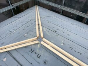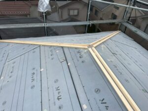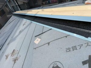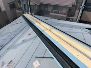これは屋根の面と面の間にできる隙間を覆い、雨水の侵入を防ぐためのものですが、土台の「貫板」を先に設置する必要があります。