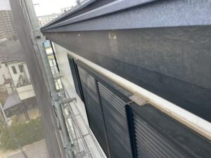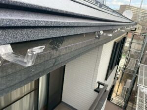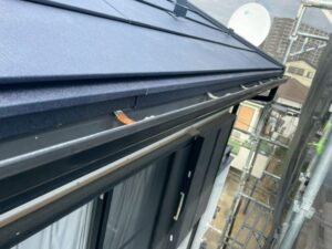 屋根の軒に沿って設置されている雨樋の勾配がずれており、雨水が適切に流れていませんでした。