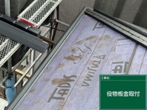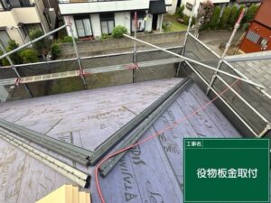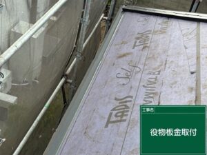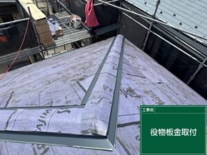 屋根材と屋根材の接合部部になって隙間ができるため、雨水の侵入しないように、板金を取り付け、防水シートでカバーしています。