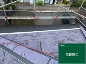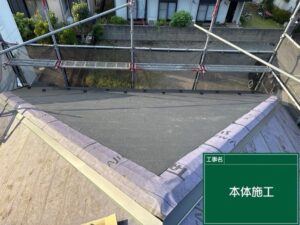 今回は古い屋根材はこのまま残し、この上から新しい防水シートと、屋根材を設置する「カバー工法」でおこなわせていただきます。
