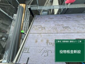 既存の屋根の上から防水シートと新しい屋根材「スーパーガルテクト」を設置させていただきました。