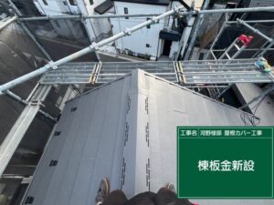 屋根の頂上に当たる部分棟に、換気棟、棟板金を設置します。