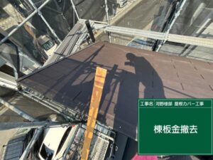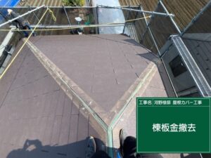 既存屋根の上から防水シート、屋根材を設置するために、頂上部にある古い棟板金を取り除いて、設置面を平らにします。