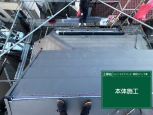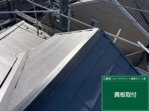 その貫板に板金をビス留めし、継ぎ目・ビス頭にはコーキングで隙間を塞ぎます。